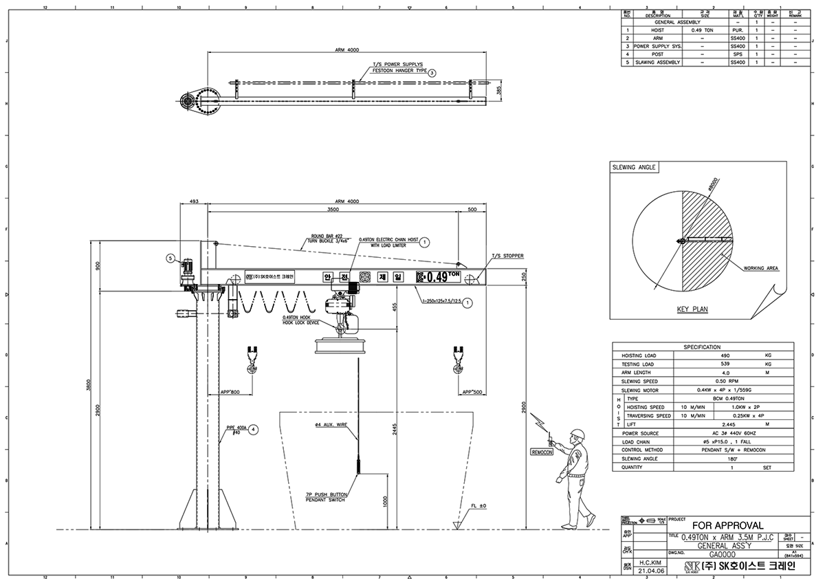 지브 크레인 Jib Crane 모델번호 SK-JC0.49-A4-P2.9-00 상세사양 JIB CRANE, POST 400A X 2.9M, ARM250X125X4M, BASE 1MX1M, HOIST 0.49TON, CHAIN, 0.8X4P, 8M/MIN, H4M, 0.3KW*2P, 440V, CYCLO MOTOR 0.4KW X 4P,[LK-LTM-0.49T/LK HOIST],COMB’P’NL, C-TRACK ACCESSARY 4M, REMOTE CONTROLLER:JUUKO 모델번호 SK-JC3-A6.5-P8-00